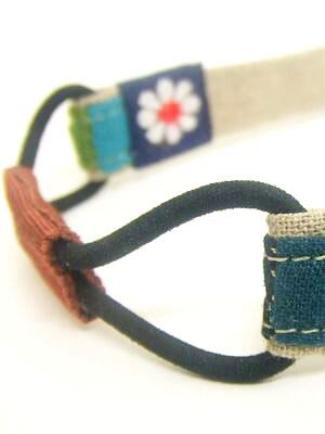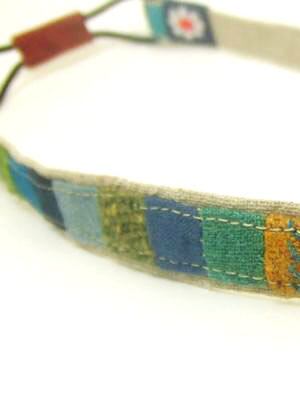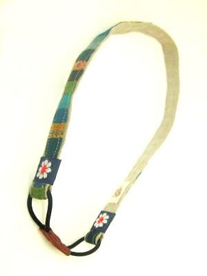 パッチワークを縫いとめたキバタの麻布に、お花の模様の綿リボンを付けた、カラフルなカチュームです。