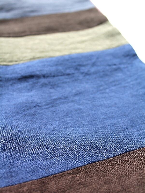 独特の色合いが素敵な天日干しリネンを繋ぎ合わせたパッチワークマフラーです。
