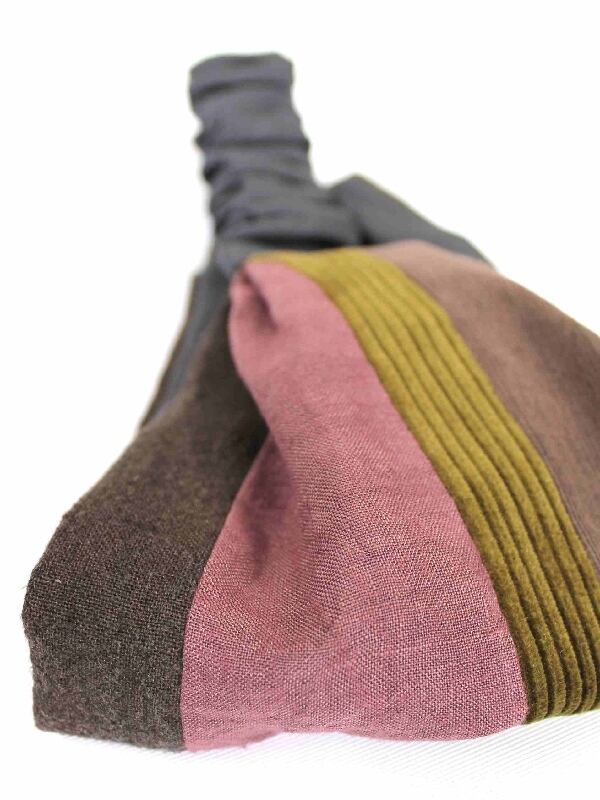 リネンやコットンなど自然素材の生地を縫い合わせたパッチワークのヘアバンド。