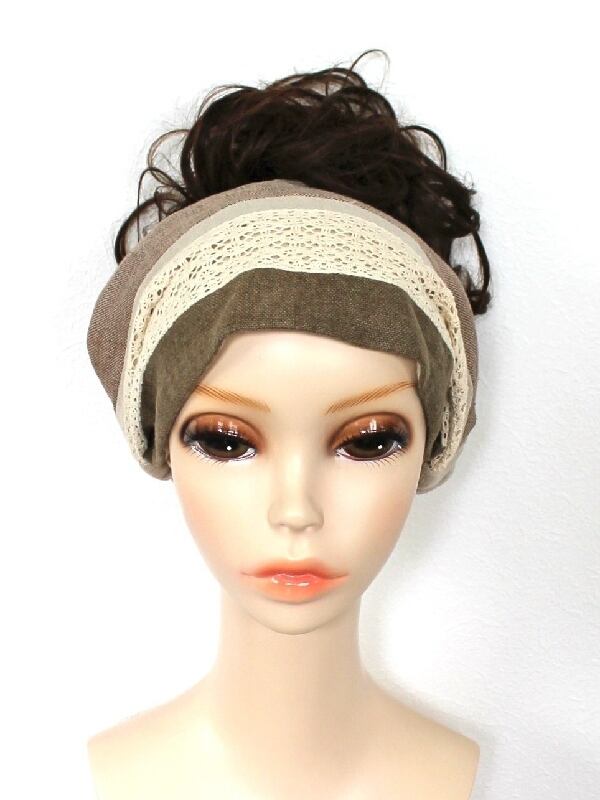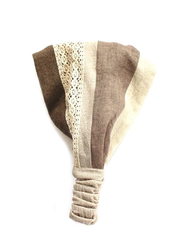 リネンやコットンなど自然素材の生地を縫い合わせたパッチワークのヘアバンド。